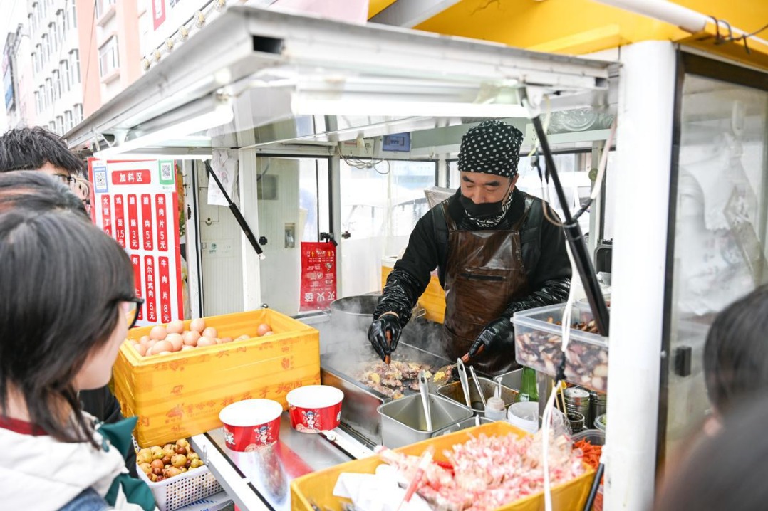 Ли Бин готви ориз с яйца в своя щанд близо до Нормалния университет в Джилин в Сипин, провинция Джилин. [Photo by Luo Hao/For chinadaily.com.cn]