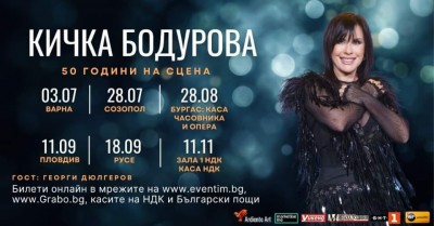 16.08.2024 Тази година Кичка Бодурова се завръща с концерти в няколко града у нас. Името на турнето е „Кичка Бодурова – Юбилеен концерт – 50 години на сцена“.  Какво по-прекрасно за един артист да празнува полувековен юбилей! Особено за Кичка Бодурова, която повече от 30 години, далеч от Родината, продължава да твори и всяко лято…